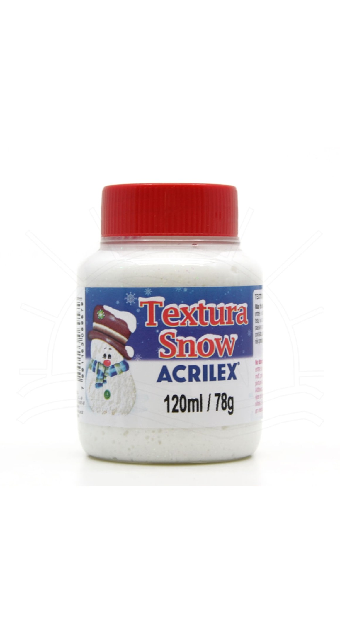 Textura com efeito de neve com glitter, para aplicação em materiais de madeira, gesso, cerâmica e tela. Para obter relevo, textura ou acabamentos especiais (enfeite decorativo). Miscíveis entre si e com as tintas acrílicas Acrilex. Pode ser aplicada com espátula sobre: Madeira, gesso, cerâmica, MDF, papel, tela, vidro, cortiça e isopor